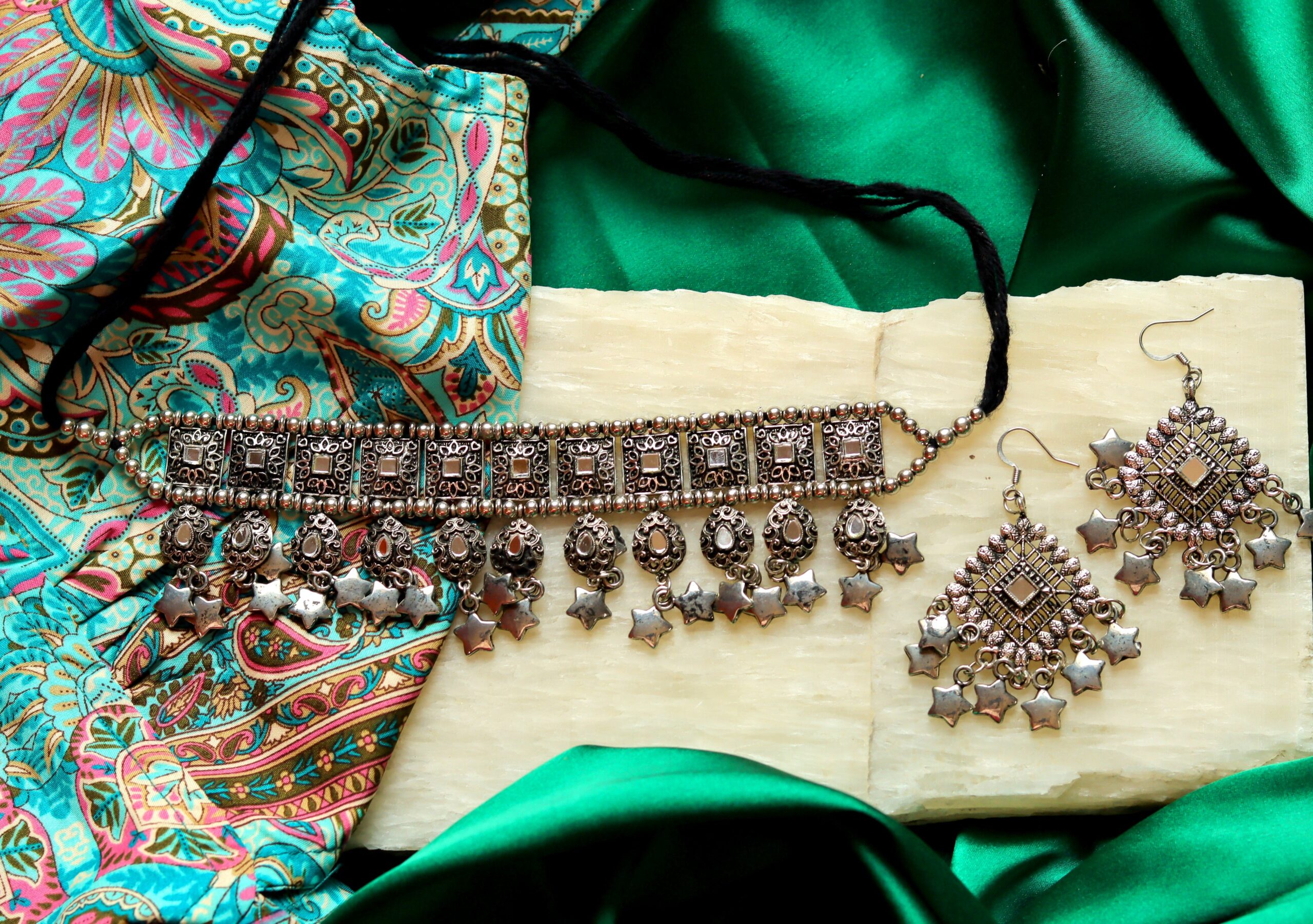 Silver oxidised choker with earrings Elevate your style with Masakali’s exquisite collection of artisan-crafted necklaces, designed to add elegance and sophistication to any outfit.